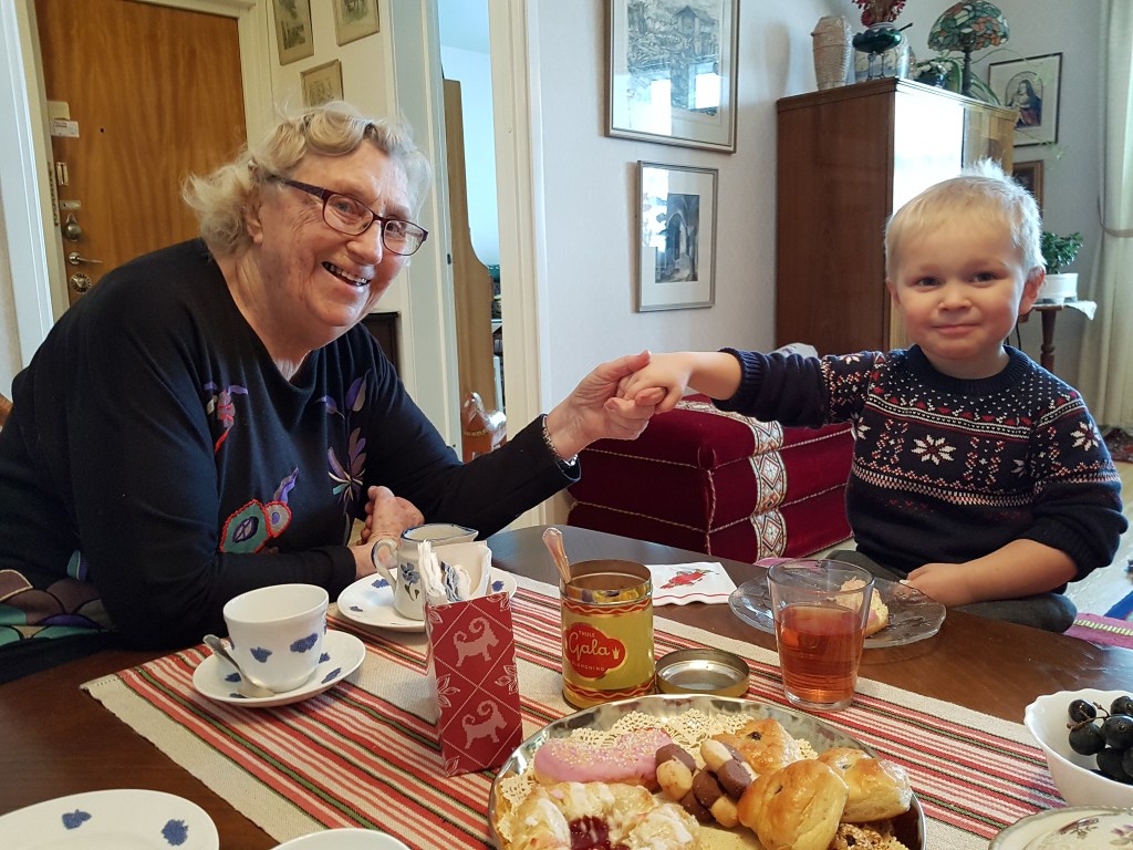 Mormor Margit konverserar med Levi över kaffe med dopp.